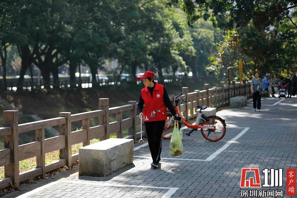 2019年11月22日,福田區(qū)新洲河旁,一位正在清理路面垃圾的義工。