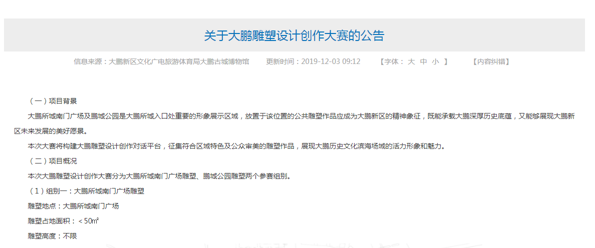 見圳客戶端·深圳新聞網(wǎng)2019年12月3日訊 為了展現(xiàn)大鵬歷史文化濱海場(chǎng)域的活力形象和魅力,12月3日,大鵬新區(qū)文化廣電旅游體育局大鵬古城博物館啟動(dòng)大鵬雕塑設(shè)計(jì)創(chuàng)作大賽,征集大鵬所城南門廣場(chǎng)及鵬城公園雕塑作品,參賽不限單位或個(gè)人,最終每組作品都將評(píng)選出6名獲獎(jiǎng)?wù)撸瑔雾?xiàng)最高獲4萬(wàn)元獎(jiǎng)金,總獎(jiǎng)金22萬(wàn)元。