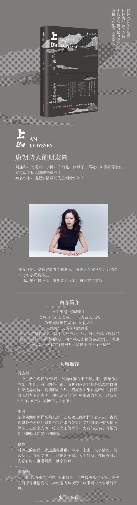 著名作家閻連科表示:“一個(gè)生活在現(xiàn)代的90后,卻始終醉心于千年史冊(cè),青年作家吟光(羅旭)寫(xiě)下的是小說(shuō),而我們讀到的卻是想像的自由和無(wú)邊界的詩(shī)。陶淵明的心燈,照亮著王維在黑暗中的行程;而王維留下的腳跡,卻也是我們前行中引路的螢光。這就是《上山》的光、美和悟得之念愿?!?/p>
