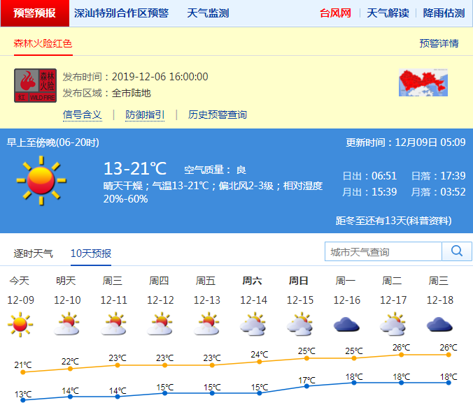 今日起氣溫逐日回升。深圳市氣象臺(tái)預(yù)測,9-11日晴天間多云,空氣非常干燥,氣溫逐日小幅度回升;12-13日晴天間多云,空氣干燥;14-16日,云量增多,濕度增大,氣溫繼續(xù)回升。天氣持續(xù)干燥,請注意用火安全。