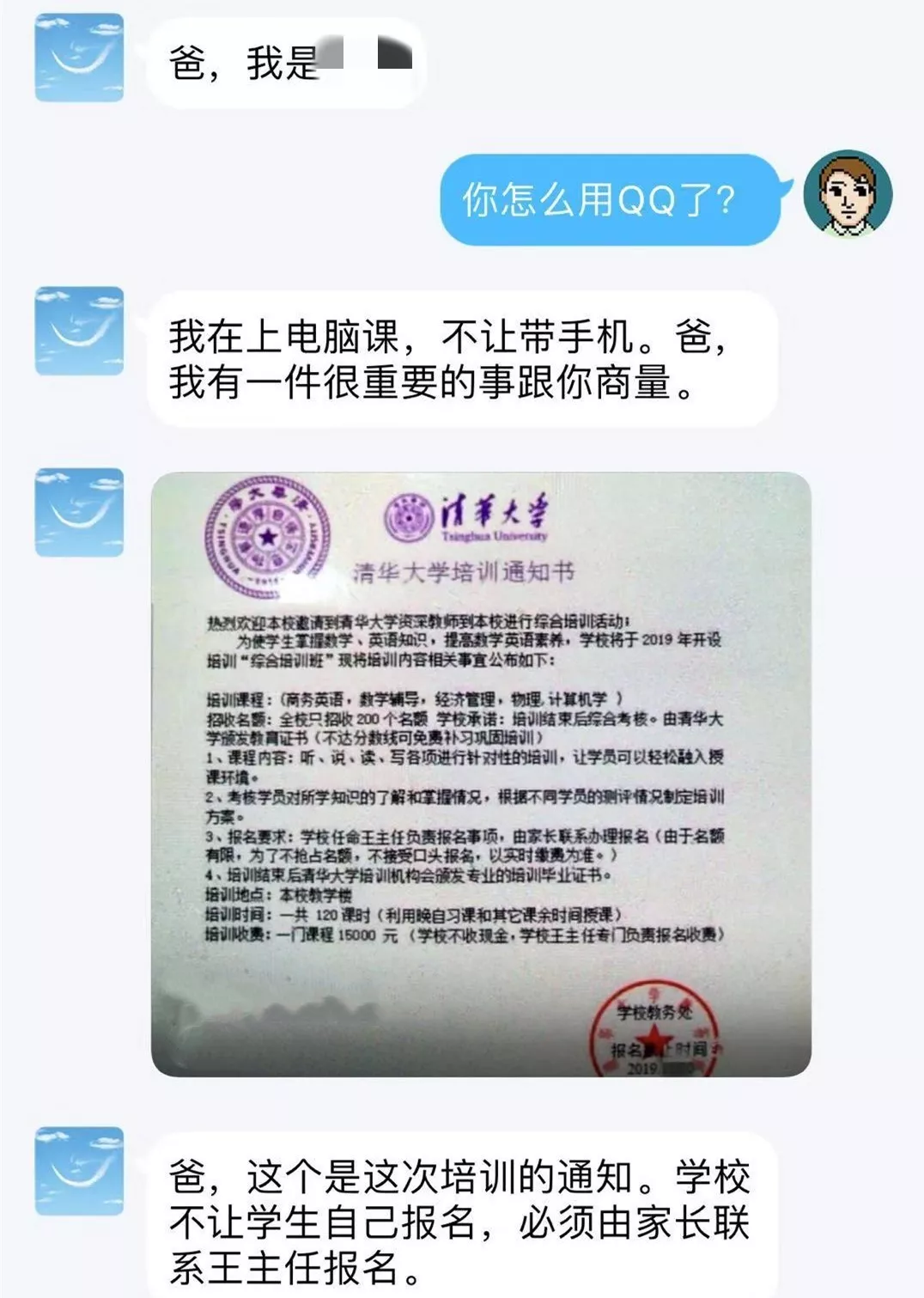 而他有一件重要的事情要與家長商量。接著發(fā)來了一張《清華大學培訓通知書》。