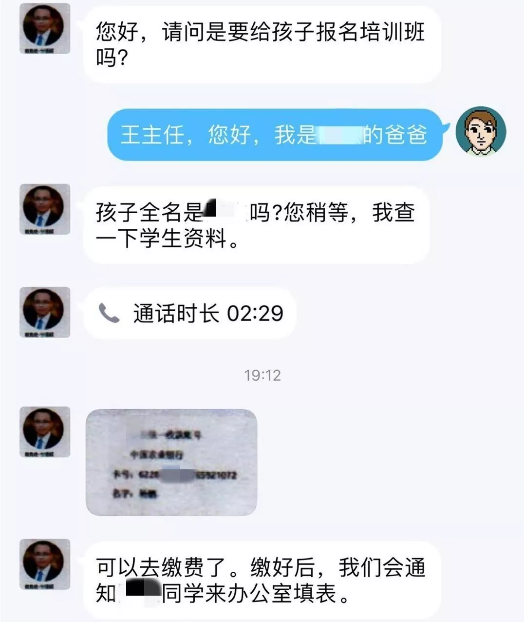 小陳也讓爸爸放心,這個錢不是打給他的,而是由家長直接繳費給“王老師”。隨后給了“王老師”的工作QQ。