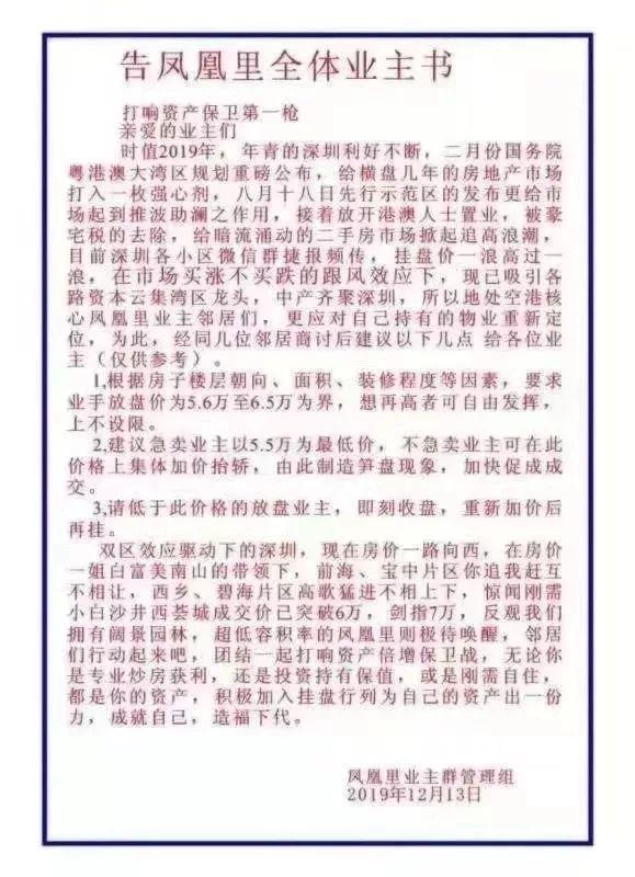 近日,福海街道中糧鳳凰里花苑小區(qū)個(gè)別業(yè)主發(fā)布集體漲價(jià)言論,涉嫌惡意炒作二手房?jī)r(jià),以下為網(wǎng)傳業(yè)主倡議書(shū)