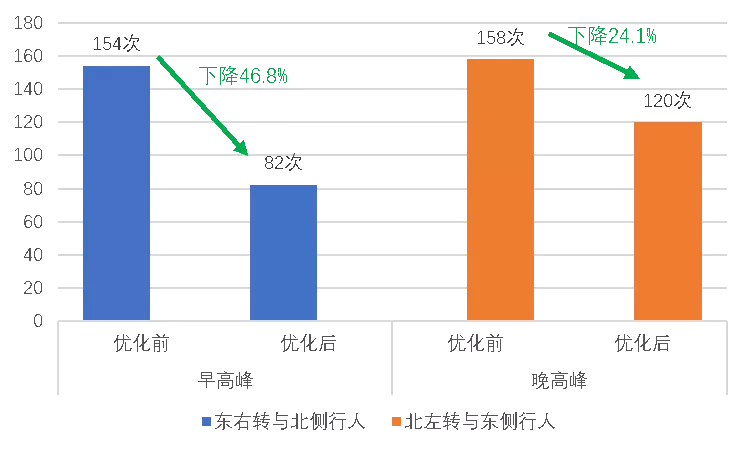 拆分東進(jìn)口機動車綠燈時間,行人晚啟,以減少東進(jìn)口右轉(zhuǎn)機動車與北側(cè)行人交織。