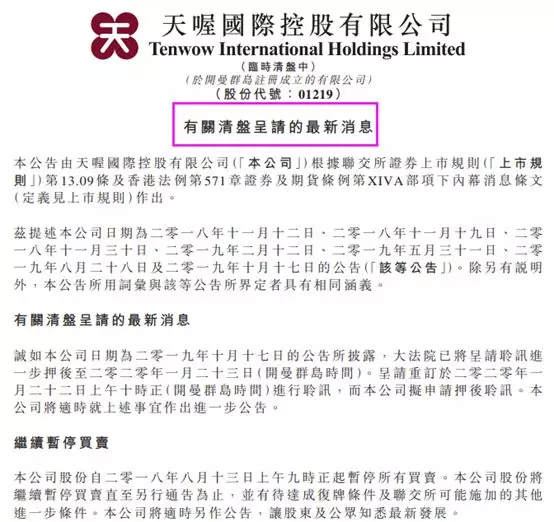 與此同時(shí),天喔國際更新了自家清盤呈請的最新消息?!?/p>