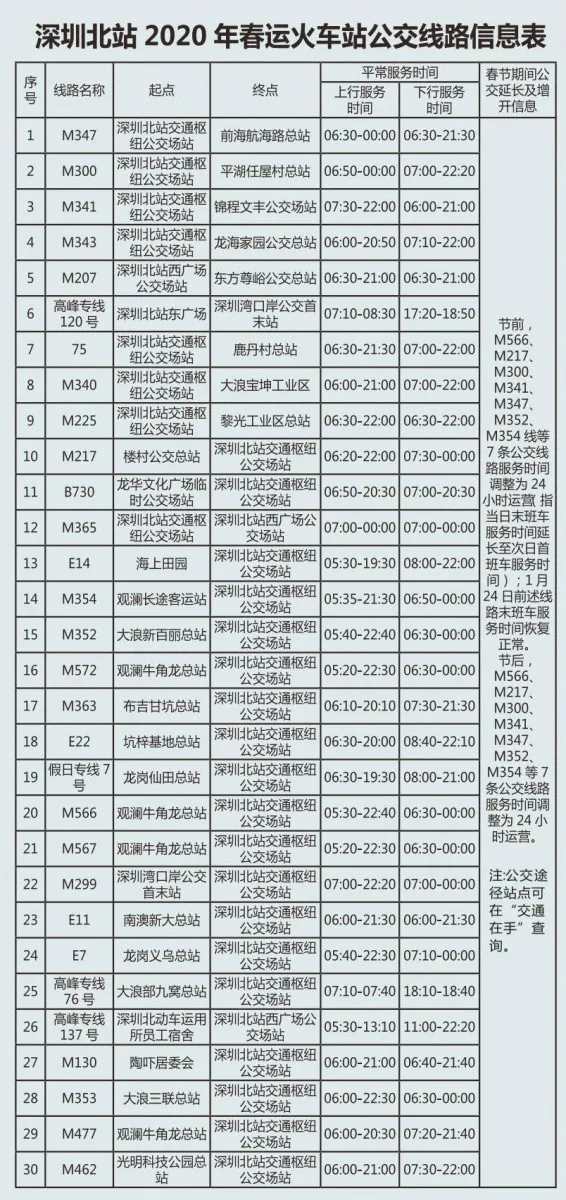 見圳客戶端·深圳新聞網(wǎng)2020年1月20日訊 又將迎來離深高峰,為方便大伙趕高鐵火車,深圳的公交地鐵都開啟最強加班模式,延長服務時間。很多小伙伴就很關(guān)心,途經(jīng)各大火車站的公交線有哪些?運營的時間是幾點?
