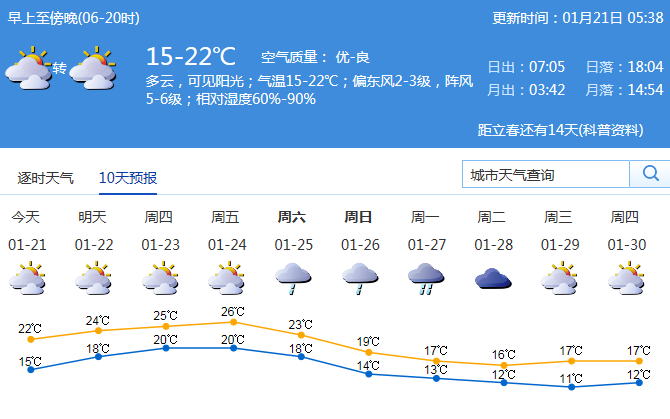 見圳客戶端·深圳新聞網(wǎng)2020年1月21日訊 據(jù)深圳市氣象臺(tái)消息,今日深圳多云,可見陽光;氣溫15-22℃;偏東風(fēng)2-3級(jí),陣風(fēng)5-6級(jí);相對(duì)濕度60%-90%。預(yù)計(jì)早晨天氣偏涼,出門注意保暖,預(yù)防感冒。