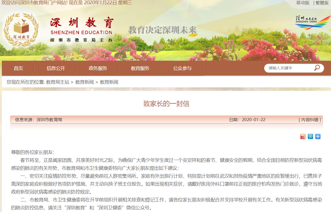 見圳客戶端·深圳新聞網(wǎng)2020年1月22日訊 1月22日,市教育局下發(fā)《深圳市教育系統(tǒng)新型冠狀病毒感染的肺炎疫情防控工作方案》的通知,引導師生假期盡量不要前往武漢和疫情嚴重地區(qū),并要求校外培訓機構(gòu)即日起全面停止春節(jié)假期補課。