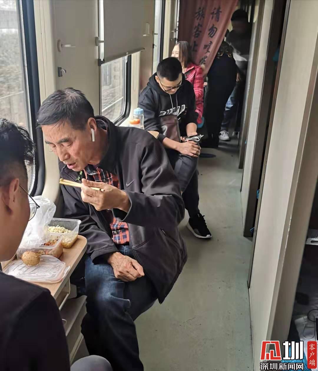 午飯期間,正在吃泡面的老人家是和我一起到終點(diǎn)站的東北人,他和妻子年輕時(shí)就來(lái)深圳打拼,每一年無(wú)論春運(yùn)的車票多么難搶,他和伴都必須回家過年,他說(shuō)回到東北,聽著大家說(shuō)的方言,熱熱鬧鬧的,才覺得這個(gè)年過得有意義。