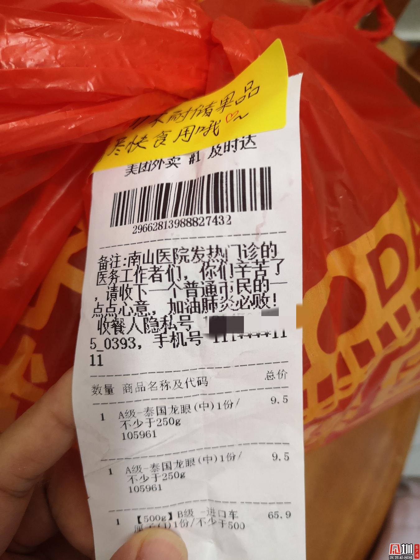 見圳客戶端·深圳新聞網(wǎng)2020年2月1日訊 (見圳客戶端、深圳新聞網(wǎng)記者 劉夢婷 通訊員 深協(xié)和)“老淚縱橫!”1月30日晚上8點(diǎn)56分,華中科技大學(xué)協(xié)和深圳醫(yī)院(南山醫(yī)院)手外科護(hù)士王敏在朋友圈曬了一張照片,瞬時(shí)網(wǎng)友們紛紛點(diǎn)贊。照片里是一個(gè)紅色塑料袋上貼著一張外賣單,備注上寫著,“南山醫(yī)院發(fā)熱門診的醫(yī)務(wù)工作者們,你們辛苦了!請(qǐng)收下一個(gè)普通市民的一點(diǎn)點(diǎn)心意,加油,肺炎必?cái)?!?/p>