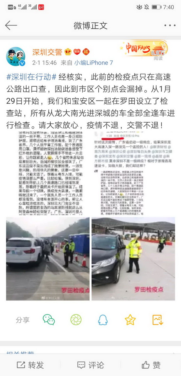 2月1日下午,深圳交警在其官方微博上表示,經(jīng)核實(shí),此前的檢疫點(diǎn)只在高速公路出口查,因此到市區(qū)個別點(diǎn)會漏掉。從1月29日開始,深圳交警和寶安區(qū)一起在羅田設(shè)立了檢查站,所有從龍大南光進(jìn)深城的車全部全逢車進(jìn)行檢查。請大家放心,疫情不退,交警不退。