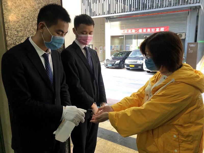 值班保安對每個(gè)進(jìn)入進(jìn)入小區(qū)的人進(jìn)行體溫測量和消毒