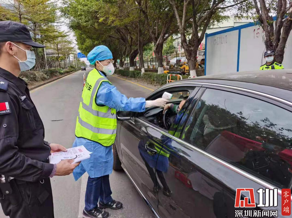 圖說(shuō):協(xié)同合作,街道同志測(cè)體溫,公安同志派發(fā)溫馨提示。