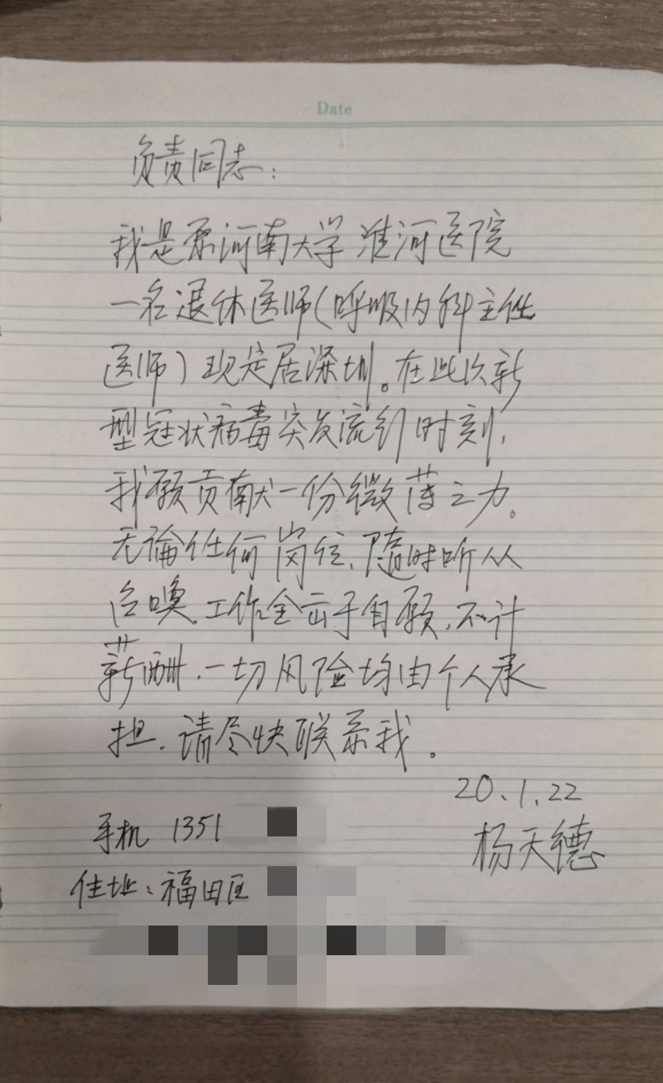 深圳新聞網(wǎng)2月4日訊(見圳客戶端、深圳新聞網(wǎng)記者 邱曉潔)1月23日,福田街道海濱社區(qū)工作站收到一封請愿書,上面寫著:“我愿貢獻一份微薄之力,無論任何崗位,隨時聽從召喚,工作全出于自愿,不計薪酬,一切風險均由個人承擔?!痹谡堅笗淖詈螅€附上了自己和愛人的聯(lián)系電話及住址。