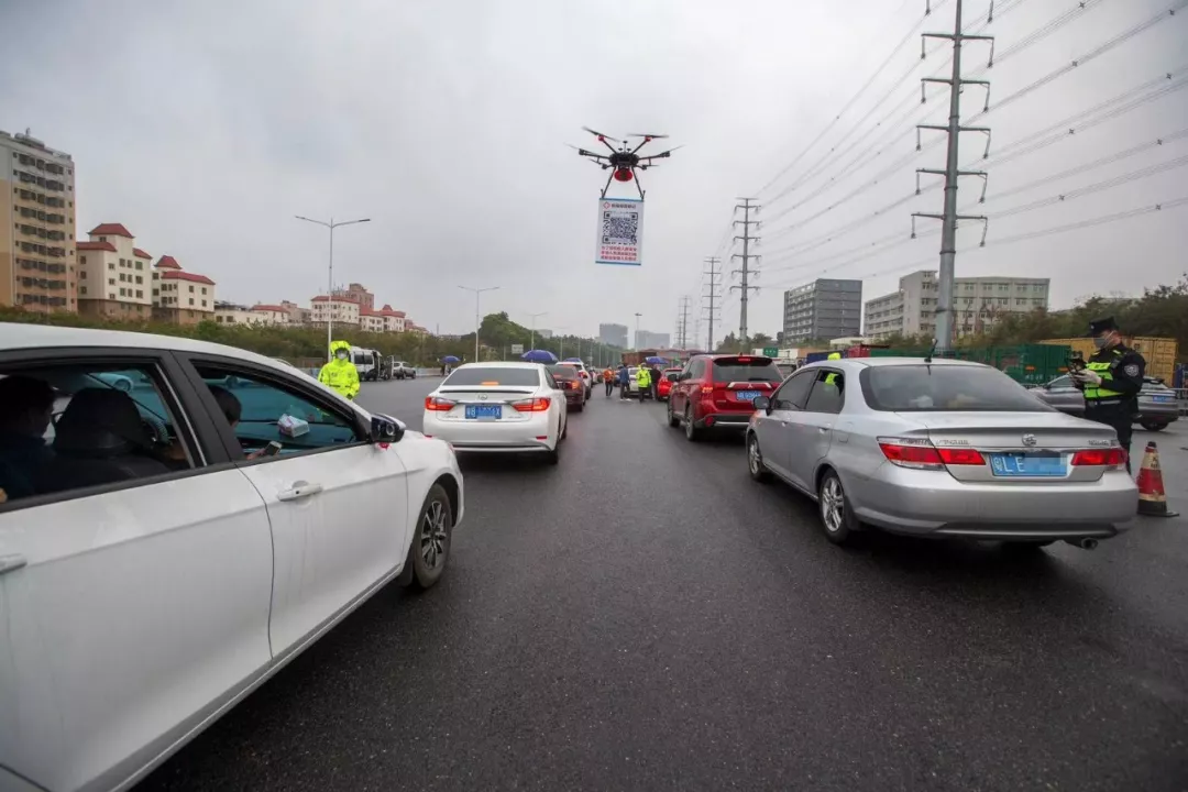 2月11日,在G94高速深圳觀瀾收費(fèi)處,深圳龍華機(jī)訓(xùn)大隊(duì)無(wú)人機(jī)飛行隊(duì)的民警操作懸掛有申報(bào)二維碼的無(wú)人機(jī)在候檢的車(chē)輛間飛行。