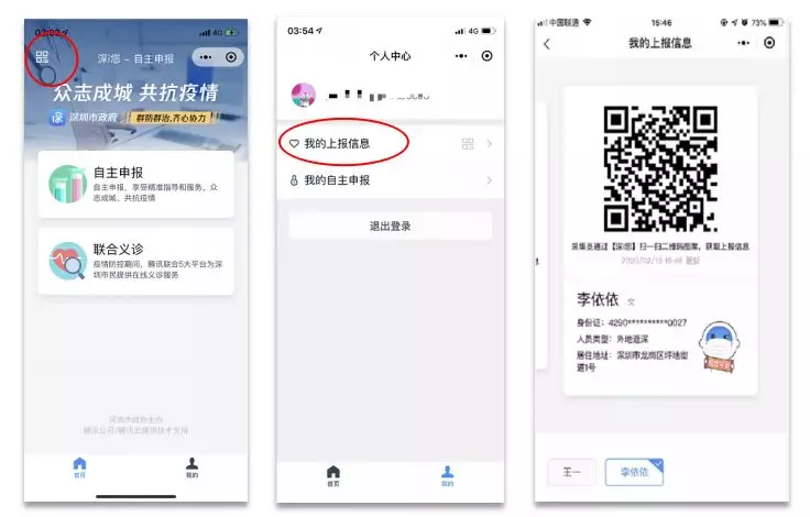 在進(jìn)出小區(qū)時(shí),可在“深i您-自主申報(bào)”小程序首頁(yè)點(diǎn)擊左上角“二維碼圖標(biāo)”或前往“我的>個(gè)人中心”點(diǎn)擊“我的上報(bào)信息”向工作人員出示“深i您-自主申報(bào)”平臺(tái)生成的系統(tǒng)認(rèn)證圖碼,憑該圖碼出入小區(qū),無(wú)需作重復(fù)申報(bào)。