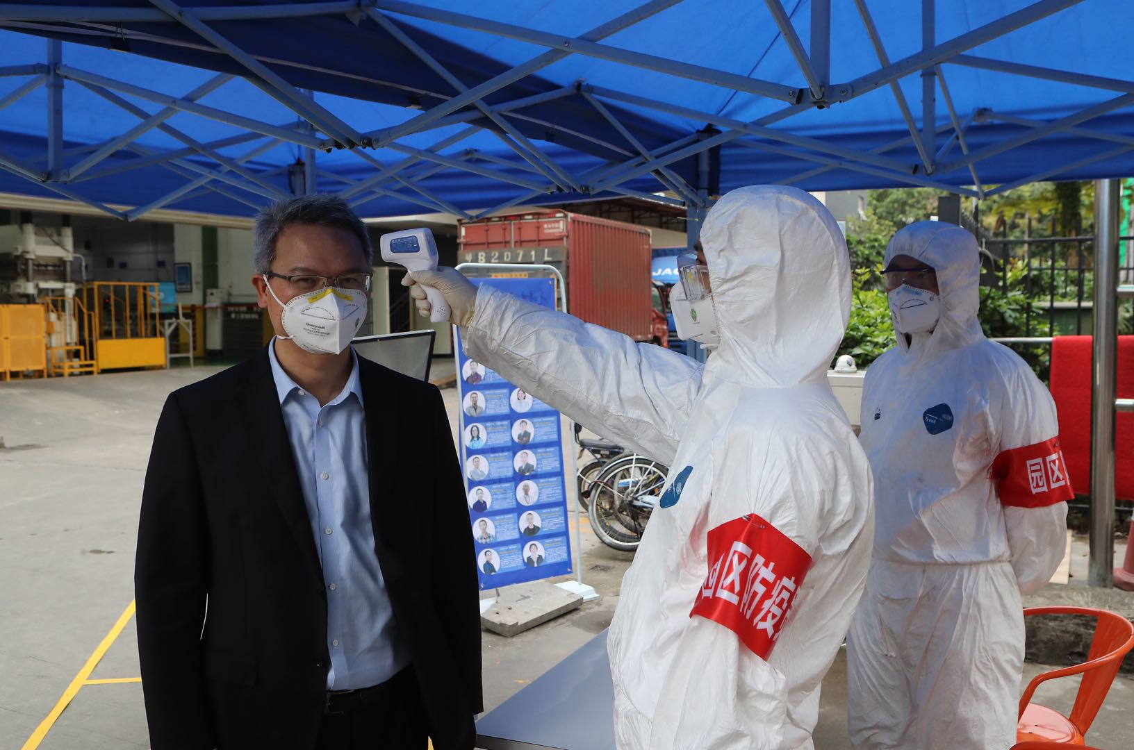 記者驅(qū)車來到該公司園區(qū)門口時,就可以見到工作人員正在對進入園區(qū)的車輛進行消殺,在門口,還有多個海報上寫著進入園區(qū)后的一些注意事項,例如在公司就餐的注意事項、自覺接受體溫測量和注意佩戴口罩等。