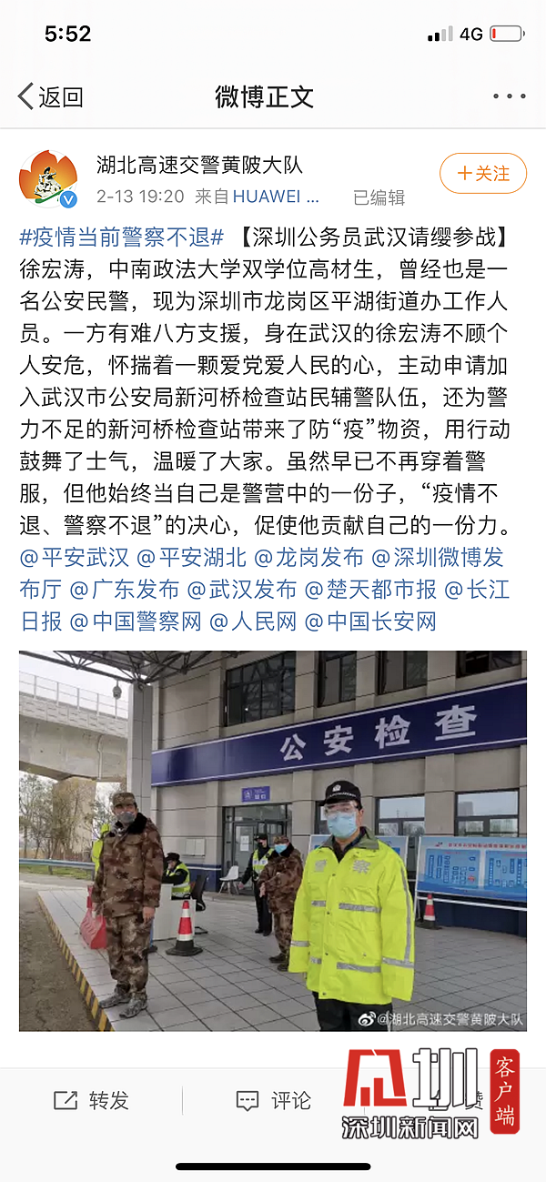 見圳客戶端、深圳新聞網(wǎng)2月16日訊(見圳客戶端、深圳新聞網(wǎng)記者 張凡 通訊員 李上彪 謝華庚)2月15日早上7點(diǎn),來(lái)自深圳市龍崗區(qū)平湖街道的黨員徐宏濤就站在了武漢新河公安檢查站的崗位上,開始一天的志愿輔警工作。他是龍崗區(qū)平湖街道黨工委辦公室主任,因春節(jié)回家探親滯留武漢,這些天來(lái),他懷揣著一顆愛黨愛人民的心,主動(dòng)申請(qǐng)加入武漢市公安局新河檢查站民輔警隊(duì)伍,還為警力不足的檢查站帶來(lái)了防疫物資,他用行動(dòng)回報(bào)這片生于斯長(zhǎng)于斯的土地,更展現(xiàn)了一名龍崗優(yōu)秀黨員的擔(dān)當(dāng)與風(fēng)貌。