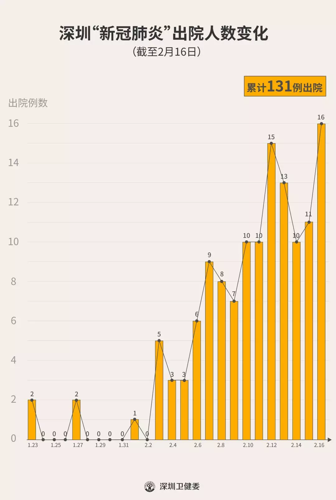 2月16日下午,經(jīng)專家組會診,深圳再有16名新型冠狀病毒肺炎確診患者出院,累計達(dá)131人,連續(xù)14天有人出院。