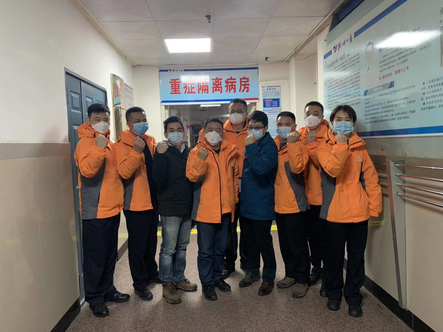 醫(yī)生團(tuán)隊(duì)共有7個(gè)人,我也將他們送到重癥隔離病區(qū)門口。我不能進(jìn)去,就和大家一起合了個(gè)影,這是我這一輩子都不能忘記的一次合影,我們每個(gè)人豎拳的手勢(shì)都那么有力,每個(gè)人的眼神都那么堅(jiān)定!連最瘦弱的女醫(yī)生單雪也看起來充滿力量。