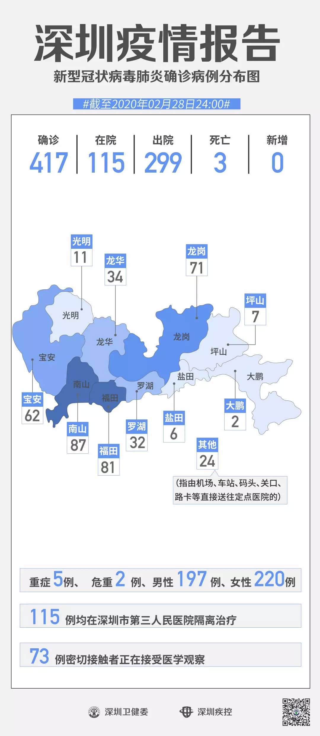 截至2月28日24時(shí),深圳累計(jì)報(bào)告“新冠肺炎”確診病例417例。2月28日當(dāng)天全市無(wú)新增確診病例,當(dāng)天出院病例18例(從26日起不再公布出院個(gè)案)。
