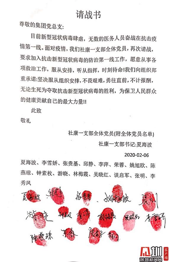 見圳客戶端·深圳新聞網(wǎng)訊(記者 董非)“讓黨旗在防控斗爭第一線高高飄揚(yáng)。”新冠肺炎疫情發(fā)生以來,南山區(qū)醫(yī)療集團(tuán)總部黨員勇當(dāng)先鋒,以實際行動踐行初心使命,涌現(xiàn)出眾多感人故事,展現(xiàn)了共產(chǎn)黨員的風(fēng)采與擔(dān)當(dāng)。 疫情發(fā)生后,南山區(qū)第一時間制定出臺了《黨建引領(lǐng)疫情防控工作五項行動方案》,南山區(qū)委書記王強(qiáng)號召全體黨員,發(fā)揮黨組織的戰(zhàn)斗堡壘作用和黨員的先鋒模范作用,全力保障人民群眾生命安全和身體健康,讓黨旗在防控疫情斗爭第一線高高飄揚(yáng),堅決打贏疫情防控人民戰(zhàn)爭、總體戰(zhàn)、阻擊戰(zhàn)。南山區(qū)醫(yī)療集團(tuán)總部積極響應(yīng),黨建引領(lǐng)下的防控抗疫工作有序科學(xué)地展開。 今年1月底,深圳市南山區(qū)區(qū)委授旗成立南山醫(yī)療系統(tǒng)黨員突擊隊。南山區(qū)醫(yī)療集團(tuán)總部緊急組建了防控新冠肺炎應(yīng)急突擊隊,僅一天內(nèi)區(qū)醫(yī)療集團(tuán)就共有169人完成第一批應(yīng)急突擊隊報名,其中黨員過半數(shù)。 疾風(fēng)知勁草,烈火煉真金。一封封請戰(zhàn)書閃電匯聚到黨總支,召即來,來能戰(zhàn),戰(zhàn)能勝,沖鋒在前就是擔(dān)當(dāng)?shù)淖蠲姥堇[;一位位黨員迅速入隊黨員突擊隊,他們重溫入黨誓言,在黨旗下實踐著醫(yī)者仁心、人間大愛;一份份入黨申請書紛沓而來,特殊時期經(jīng)受特殊考驗,一批優(yōu)秀的醫(yī)護(hù)人員頁主動向黨組織靠攏。鏗鏘的語言、堅定的決心、舍我的擔(dān)當(dāng),是南山區(qū)醫(yī)療集團(tuán)總部廣大黨員逆行而上、抗擊疫情的堅定決心和必勝信心。 最美逆行黨支部,積極請戰(zhàn)敢擔(dān)當(dāng) “我是共產(chǎn)黨員,我請戰(zhàn)!愿為戰(zhàn)勝疫情全力以赴!”這是南山區(qū)醫(yī)療集團(tuán)總部一支部13名黨員和2名入黨積極分子聯(lián)名撰寫的《請戰(zhàn)書》(節(jié)選)。 面對新冠肺炎疫情,一支部黨員在夏海波支部書記夏海波的帶領(lǐng)下,在發(fā)熱門診、發(fā)熱患者預(yù)檢分診、社區(qū)“三位一體”排查等工作中,積極發(fā)揮共產(chǎn)黨員戰(zhàn)斗在一線、沖鋒在一線的模范帶頭作用,為戰(zhàn)勝新冠肺炎疫情全體黨員積極主動請戰(zhàn),并向集團(tuán)黨總支遞交了請戰(zhàn)書。 社康一支部全體黨員的請戰(zhàn)書 一個個紅手印,令人淚目,彰顯著南山區(qū)醫(yī)療集團(tuán)總部白衣天使們逆行而上的使命擔(dān)當(dāng)和責(zé)任意識。 一支部書記夏海波說,“成為疫情防控工作第一線發(fā)展黨員,是面對疫情充分發(fā)揮黨員先鋒作用的具體實踐。此次請戰(zhàn),將更加激勵他們我們在今后的工作特別是近期防疫防控工作中,以黨員的標(biāo)準(zhǔn)嚴(yán)格要求自己,發(fā)揮黨員先鋒模范作用。同時,也會對全院全體員工產(chǎn)生積極引領(lǐng)、鼓舞作用,以更飽滿的斗志投入防疫防控工作?!?/p> 老黨員重溫入黨誓詞,面對黨旗表決心 “我宣誓:我志愿加入中國共產(chǎn)黨……”這是一次特別的宣誓。接到組織號召后,社康二支部的老黨員鐘達(dá)宏和吳麗娉,對著黨旗,以重溫入黨誓詞的方式,不忘黨員初心,牢記使命,積極沖鋒在前,誓要打贏防控狙擊戰(zhàn)。 社康二支部的老黨員鐘達(dá)宏和吳麗娉,對著黨旗,重溫入黨誓詞,誓要打贏防控狙擊戰(zhàn) 面對來勢洶洶的疫情,南山區(qū)醫(yī)療集團(tuán)總部的黨組織和黨員干部不但沒有被嚇倒,反而激起了他們昂揚(yáng)的戰(zhàn)斗意志和飽滿的工作熱情。 “我宣誓,我自愿加入抗擊新型冠狀病毒肺炎疫情防控工作隊伍,責(zé)任上肩,聽黨指揮,服從命令,科學(xué)應(yīng)對,恪盡職守,努力守護(hù)轄區(qū)居民健康,堅決打贏疫情防控攻堅戰(zhàn)!”守土有責(zé)、守土擔(dān)責(zé)、守土盡責(zé),所有社康中心的黨員干部將筑牢抗疫的基層防線,誓要守護(hù)轄區(qū)居民的生命健康。 社康二支部黨員在黨旗下宣誓努力守護(hù)轄區(qū)居民健康 艱難時刻主動請戰(zhàn),夫妻雙雙奮戰(zhàn)一線 1月26日,南山區(qū)醫(yī)療集團(tuán)總部下發(fā)關(guān)于組建防控新型冠狀病毒感染肺炎應(yīng)急突擊隊報名的通知。除了得到集團(tuán)黨員們的積極響應(yīng)之外,各個支部涌現(xiàn)出一波遞交入黨申請書的小高潮。 李婧是社康支部的一名全科醫(yī)生,一直在社康醫(yī)院中心從事全科醫(yī)療工作,戰(zhàn)“疫”的號角吹響,李婧第一時間參戰(zhàn),在所有抗疫時期入黨人員里第一個遞交了手寫入黨申請書。 李婧醫(yī)生的手寫入黨申請書 起初,她所在的蔚藍(lán)海岸社康中心考慮到李婧的愛人是深圳市公立醫(yī)院急診科醫(yī)生其愛人是深圳市某公立醫(yī)院的急診科醫(yī)生,疫情發(fā)生以來一直堅守在崗位上,家中尚有1歲零3個月的寶寶,就沒有讓她參加社區(qū)“三位一體”排查和酒店留守值班等一線工作和醫(yī)學(xué)觀察點留守值班等一線工作。李婧得知后,她主動提交請戰(zhàn)書、舍小家顧大家,并沒有因為生活上的困難而有所退縮,主動要求參與疫情排查一線工作。李婧夫妻還制定了家庭的“交接班”制度,一個去上白班,另一個就上夜班。 執(zhí)行三位一體排查工作前,李婧醫(yī)生與民警、社區(qū)工作者