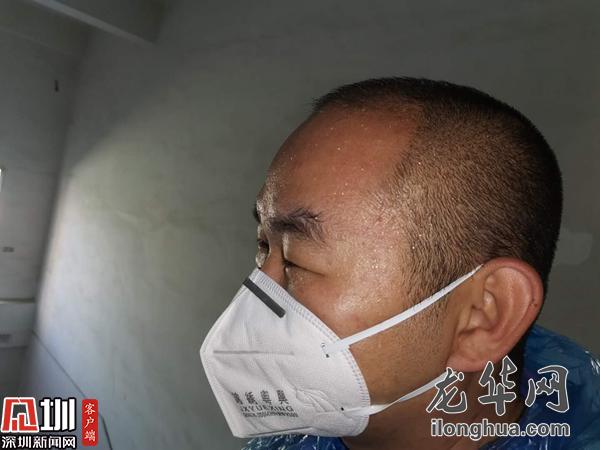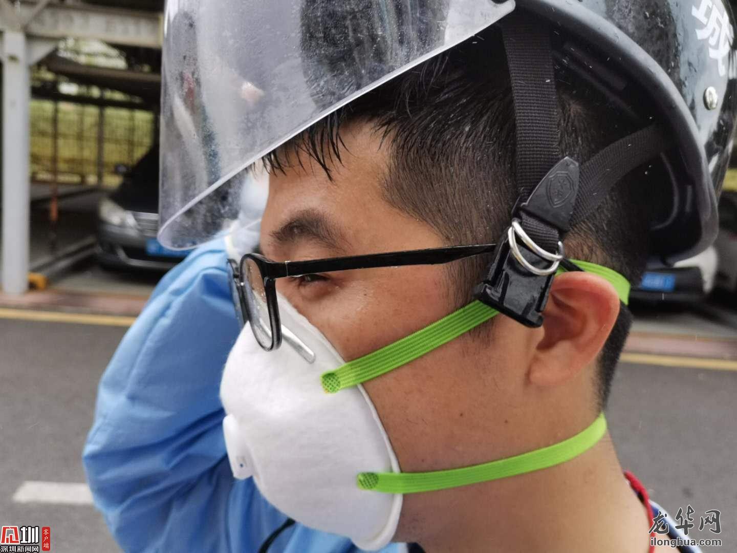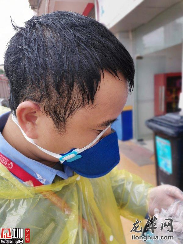 接到有返深人員的通知,他立刻帶隊(duì)趕往現(xiàn)場(chǎng),多次測(cè)溫后仍體溫偏高,他不放心地叫來(lái)三位一體人員,一番確認(rèn)之后,將發(fā)熱人員送往醫(yī)院,他則獨(dú)自善后對(duì)樓道進(jìn)行消毒,將近兩個(gè)小時(shí)的折騰,他終于得以到垃圾桶旁邊喘口氣。額頭勒出的印痕和黏在后背的制服,都是每一天的勛章。