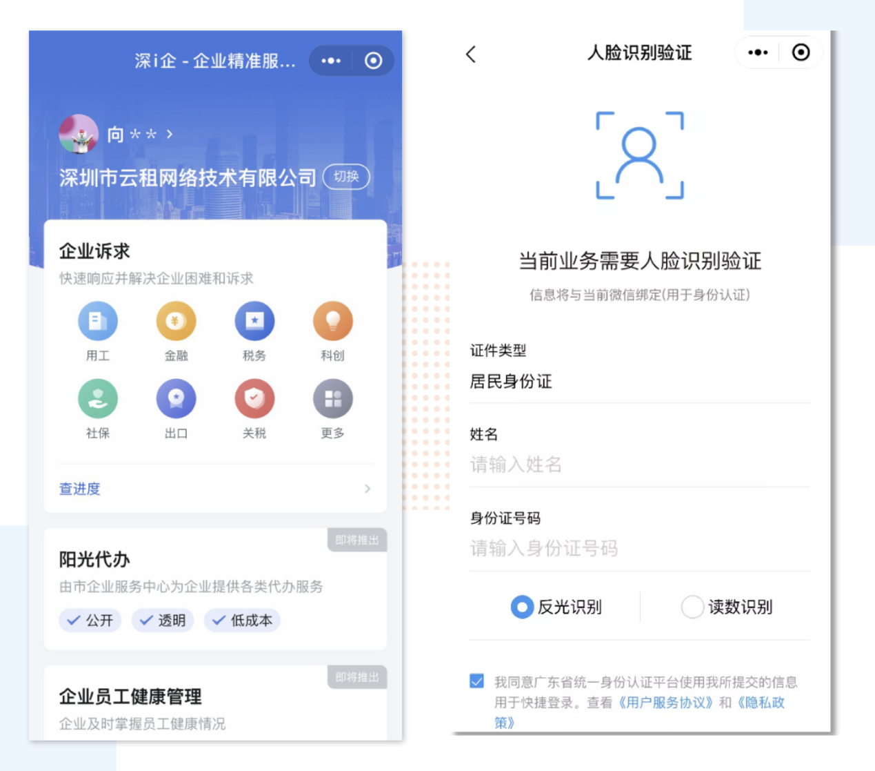 企業(yè)法人或經(jīng)辦人進(jìn)入“深i企-精準(zhǔn)服務(wù)服務(wù)”平臺,選擇登錄,進(jìn)入實名認(rèn)證環(huán)節(jié)。輸入姓名和證件號碼后,通過人臉識別即可完成實名認(rèn)證。