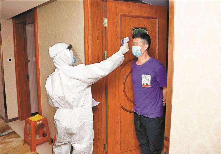 ▲醫(yī)務(wù)人員為醫(yī)學(xué)觀察人員測量體溫。深圳晚報(bào)記者楊少昆攝