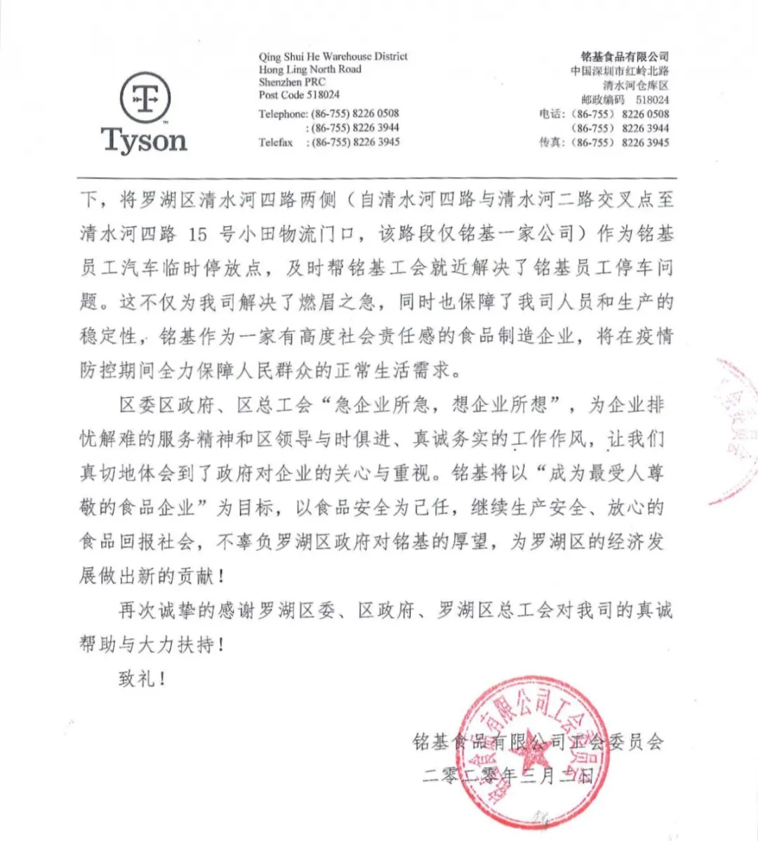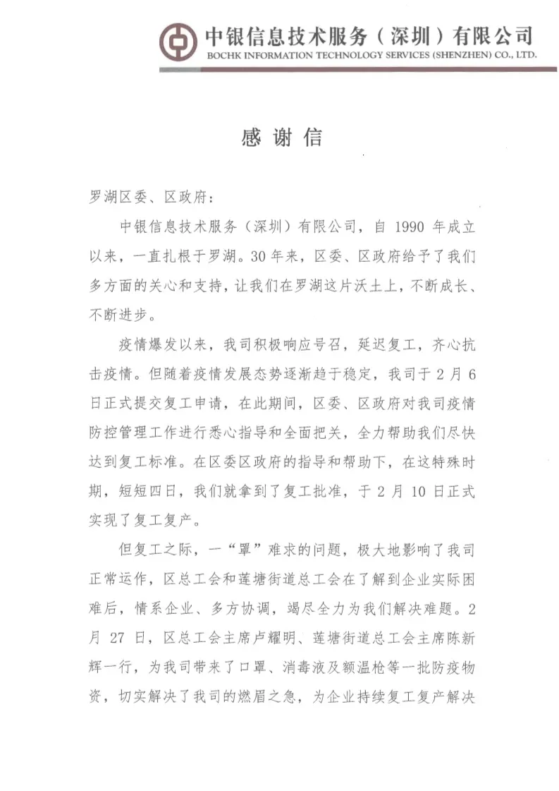 中銀信息技術(shù)服務(wù)(深圳)有限公司、銘基食品有限公司在復(fù)工復(fù)產(chǎn)后都遇到了一些困難,羅湖工會(huì)了解了他們的情況后,主動(dòng)發(fā)揮工會(huì)作用,幫企業(yè)解決困難,協(xié)助他們順利復(fù)工復(fù)產(chǎn)。近日,兩封感謝信送到了羅湖區(qū)委、區(qū)政府,向羅湖羅湖區(qū)委、區(qū)政府以及羅湖各級(jí)工會(huì)為企業(yè)的付出表示感謝。