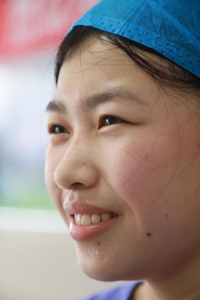黃青青性格開朗,適應(yīng)能力強,她平時不愛吃的胡蘿卜、包菜等食物,但到了一線再也不挑食了。身材瘦弱的她在忙碌十多天后有些消瘦,但她總是打趣道:“別看我瘦,力量可大著呢!”協(xié)助病人翻身,耐心為病人喂飯,只要病人需要的,她都會盡自己的全力做好,病區(qū)的病人也為她豎起大拇指。