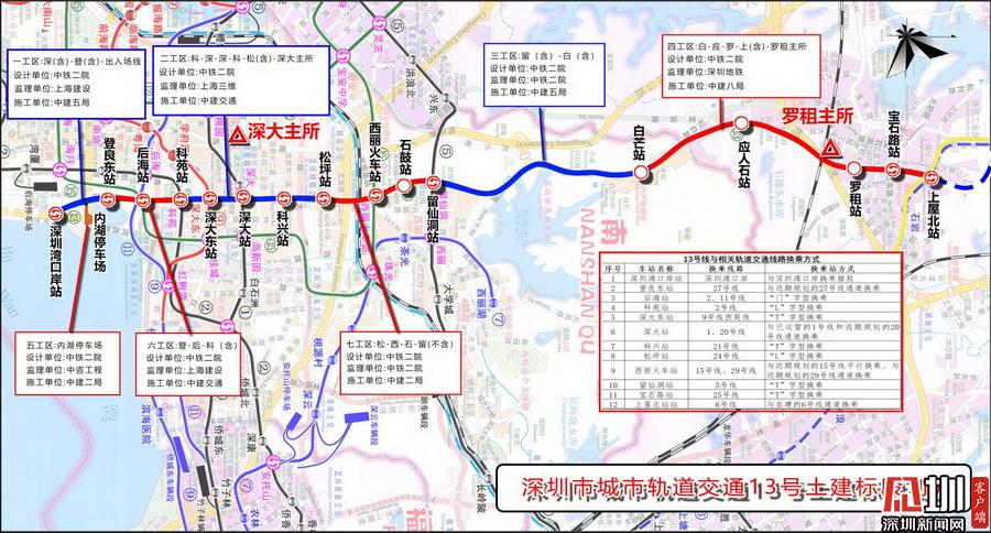 據(jù)了解,地鐵13號線由南至北穿過南山區(qū)、寶安區(qū)和光明新區(qū)。項目共設車站16座,線路總長22.436公里,出入線與后海站接軌,將穿越已運營的地鐵1號線、2號線、5號線、11號線。由于沿途工程地質條件復雜、換乘站多、工程實施難度大、長區(qū)間盾構、拆遷工作繁重、交通疏解復雜等原因,13號線被稱為深圳地鐵建設史上最難的地鐵線路之一。