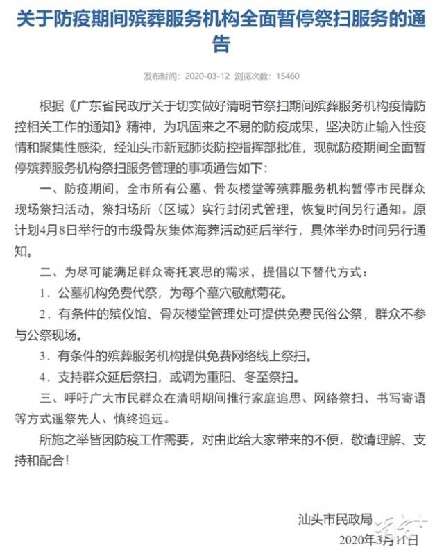 汕頭全市所有公墓、骨灰樓堂等殯葬服務(wù)機(jī)構(gòu)暫停市民群眾現(xiàn)場祭掃活動,祭掃場所(區(qū)域)實(shí)行封閉式管理,并提倡以下替代方式:公墓機(jī)構(gòu)免費(fèi)代祭,為每個墓穴敬獻(xiàn)菊花;有條件的殯儀館、骨灰樓堂管理處可提供免費(fèi)民俗公祭,群眾不參與公祭現(xiàn)場;有條件的殯葬服務(wù)機(jī)構(gòu)提供免費(fèi)網(wǎng)絡(luò)線上祭掃;支持群眾延后祭掃,或調(diào)為重陽、冬至祭掃。