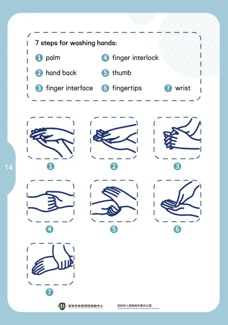 七步洗手法(內(nèi)、外、夾、弓、大、立、腕,通過圖片展示)。