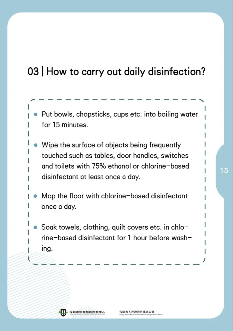 臺面、門把手、開關(guān)、馬桶等常接觸使用的物品表面,每天至少用75%酒精或含氯消毒劑擦拭一次。
