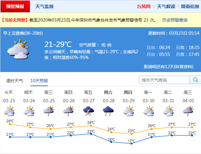 見圳客戶端·深圳新聞網(wǎng)2020年3月22日訊 深圳今天多云間晴天,早晚有輕霧;氣溫21-29℃;東南風(fēng)2級;相對濕度60%-95%。