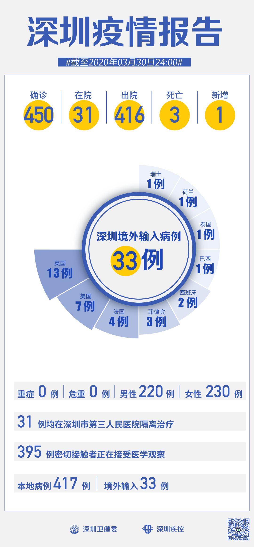 3月30日,深圳確診1例境外輸入“新冠肺炎”新病例,累計達33例。