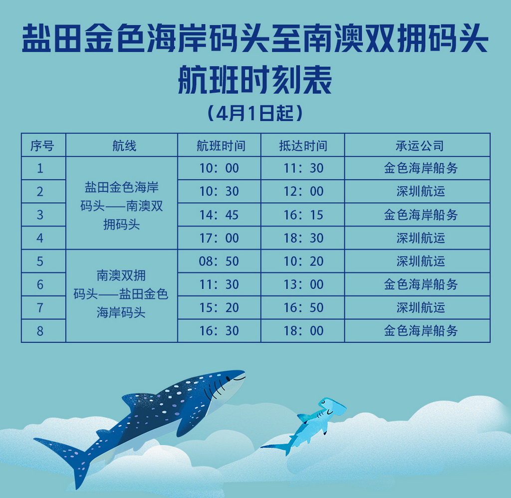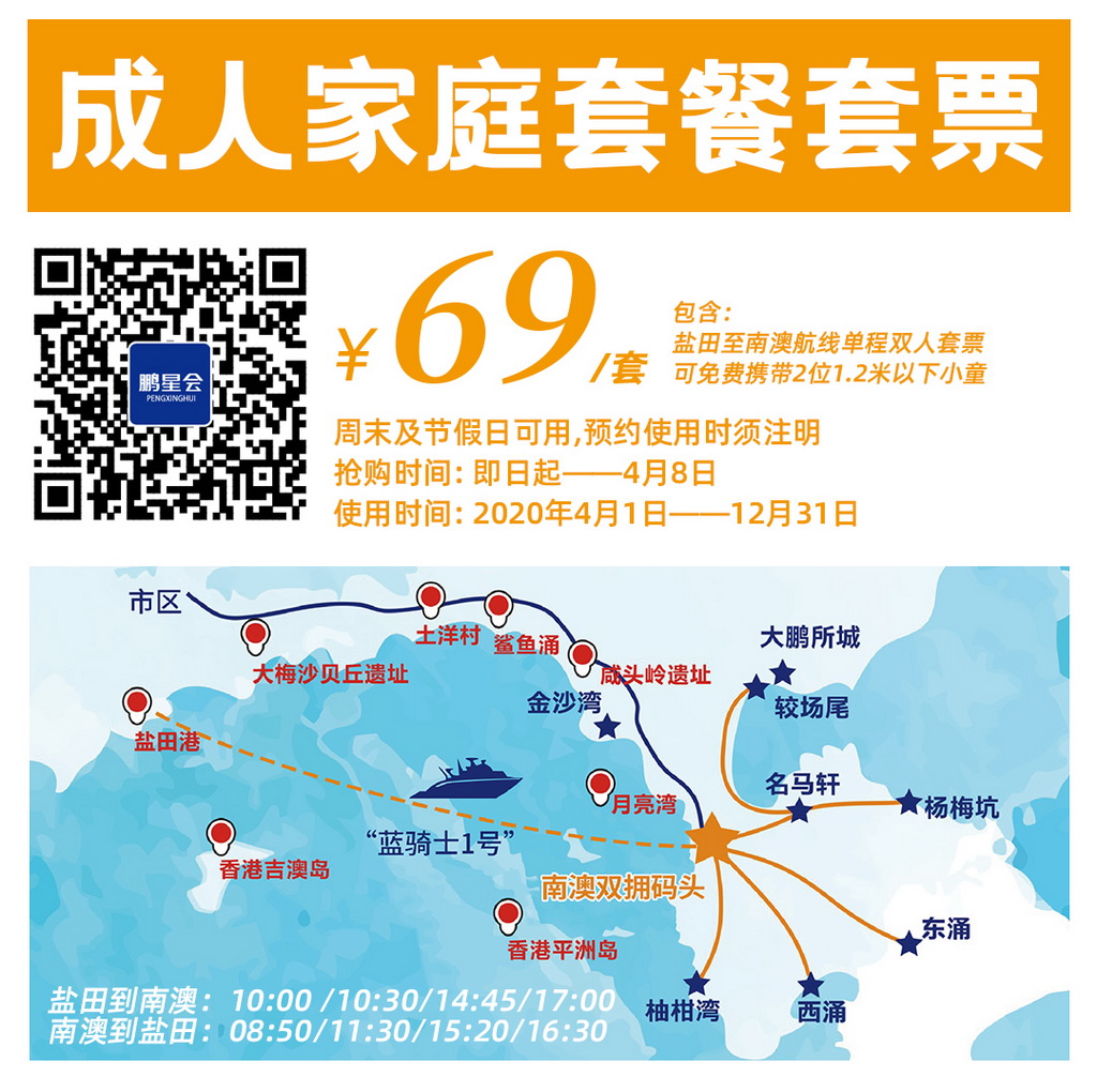 此外,即日起至4月8日,“鵬星會”專門推出69元“鹽田-南澳”航線家庭套票特價套餐搶購活動,套餐包含2位成人(可免費攜帶2位身高1.2米以下小童)全航班單程船票,有效期為2020年4月1日至12月31日,周末及節(jié)假日均可使用,市民及旅客朋友可通過“鵬星會”公眾號下單搶購,搶購成功后,在出發(fā)前需至少提前1天以上致電4001020860預(yù)約,該套餐不接受出發(fā)當(dāng)天預(yù)約。