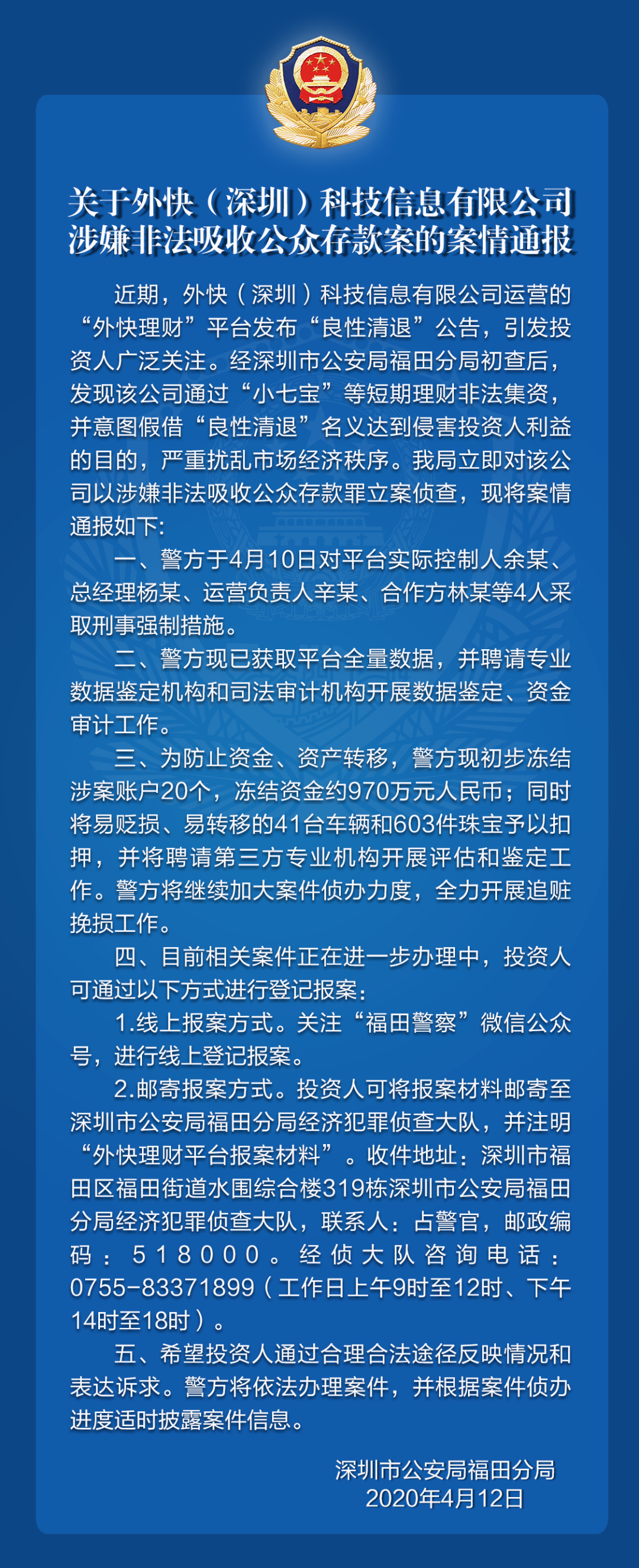 關(guān)于外快(深圳)科技信息有限公司涉嫌非法吸收公眾存款案的案情通報