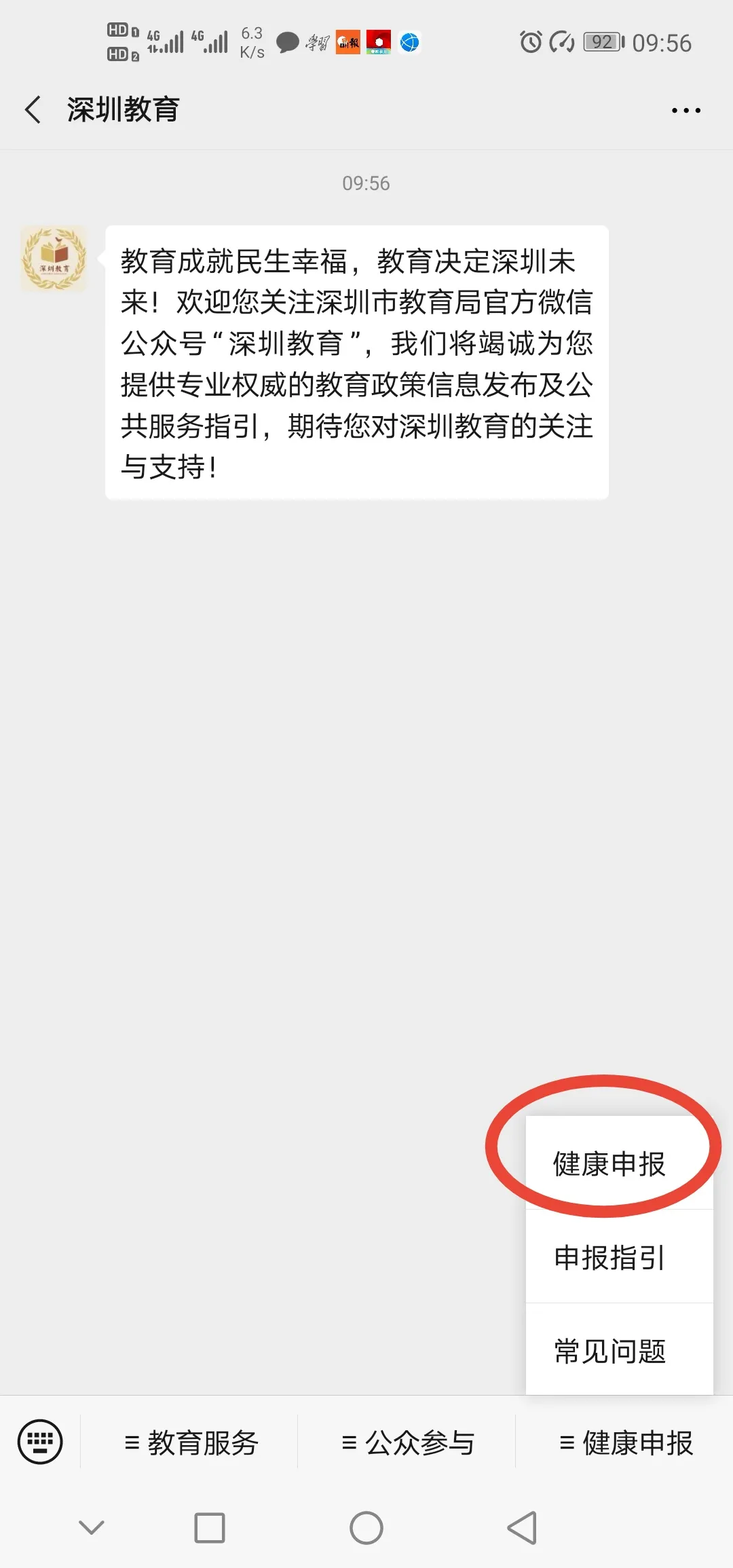 微信關(guān)注“深圳教育”微信公眾號(hào),點(diǎn)擊底部菜單欄“健康申報(bào)”即可申報(bào)。