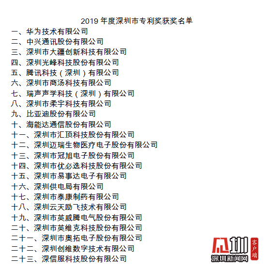 會(huì)議同期還發(fā)布了2019年度深圳市專利獎(jiǎng)獲獎(jiǎng)企業(yè)名單,華為技術(shù)有限公司、中興通訊股份有限公司、深圳市大疆創(chuàng)新科技有限公司、深圳光峰科技股份有限公司、騰訊科技(深圳)有限公司、深圳市商湯科技有限公司、瑞聲聲學(xué)科技(深圳)有限公司等23家單位獲獎(jiǎng)。