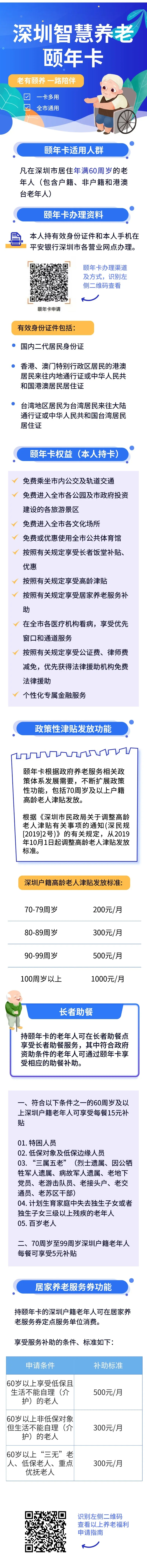 據(jù)悉,凡在深圳市居住年滿60周歲以上的老年人(包含港澳臺老年人),均可持有效身份證件和手機申請辦理。“頤年卡”持卡人,可享受敬老優(yōu)待,包括免費進入全市各公園,免費進入市政府投資建設(shè)各旅游景區(qū),免費乘坐市內(nèi)公交車和軌道交通。70周歲及以上戶籍老人還可享受高齡津貼發(fā)放;符合規(guī)定的戶籍老年人可享受居家養(yǎng)老消費的優(yōu)惠和補貼,包括:生活照料、家政服務(wù)、康復護理服務(wù)、日托服務(wù)、心理咨詢等。