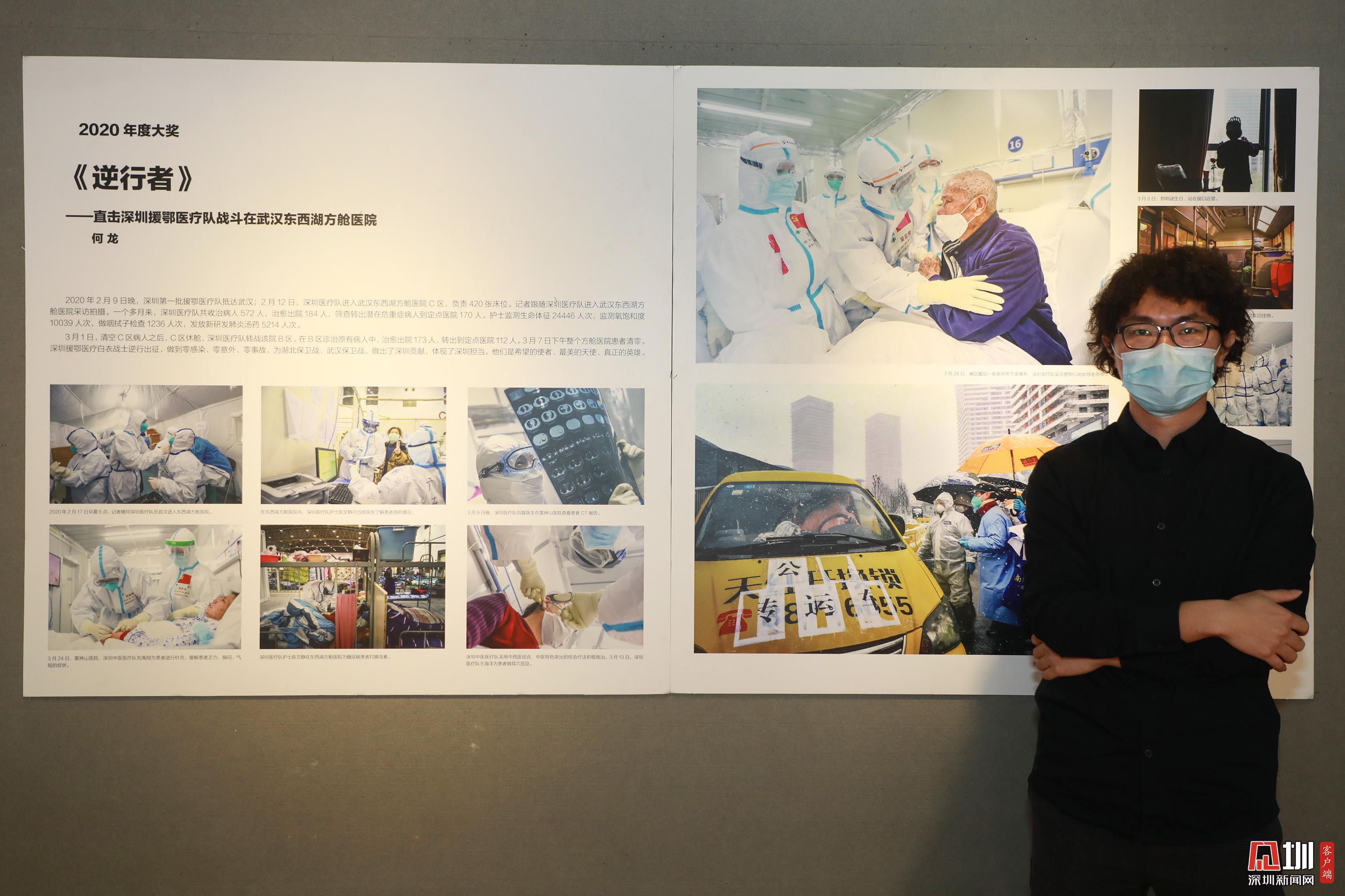 何龍告訴記者,從2020年2月9日晚跟隨著深圳第一批援鄂醫(yī)療隊抵達(dá)武漢,到3月31日和最后一批醫(yī)護(hù)人員一起回到深圳,他全程和深圳援鄂的醫(yī)療隊一起親歷了這場抗疫。在獲得本次攝影大賽年度大獎的攝影作品《逆行者》中,既不乏醫(yī)護(hù)人員幫助彼此穿戴防護(hù)服具、結(jié)束一天工作后乘坐空曠的公交車回住所等抗疫工作的細(xì)枝末節(jié),也有深圳援鄂醫(yī)生們對患者們注射胰島素,使用耳穴壓豆、針灸等中醫(yī)療法進(jìn)行救治的醫(yī)療現(xiàn)場紀(jì)實;此外,還有東西湖方艙醫(yī)院終于休艙當(dāng)天,恰好過生日的醫(yī)護(hù)人員頭戴著生日紙冠靜靜眺望此刻窗外的武漢時的細(xì)膩情景。