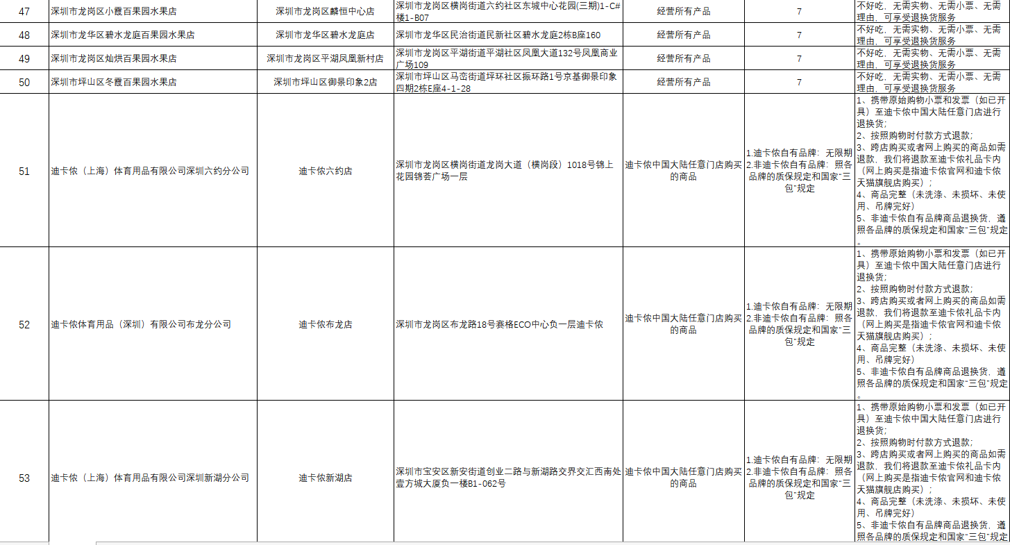 “首批參與的部分企業(yè)承諾遠(yuǎn)高于活動(dòng)基本要求,退貨期限不止是7天?!笔邢瘯?huì)相關(guān)負(fù)責(zé)人舉例說,天虹商場聯(lián)營服裝鞋帽類和日用商品類承諾的退貨限期為30天,錢大媽和迪卡儂自有品牌承諾無退貨限期。