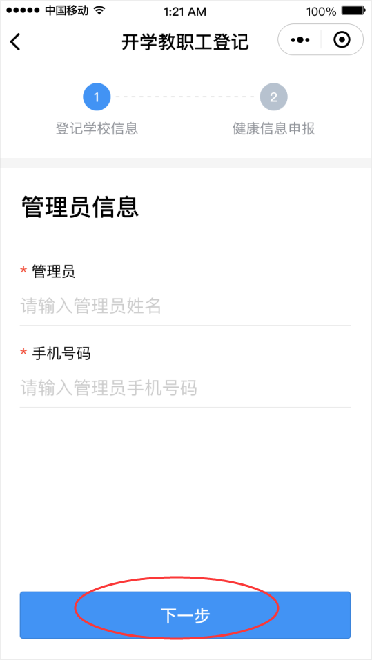 ②點擊“馬上登記”按鈕,填寫學校管理員姓名和手機號碼(學校管理員姓名和手機號碼請詢問學校獲得)后點擊“下一步”,然后選擇對應的學校。