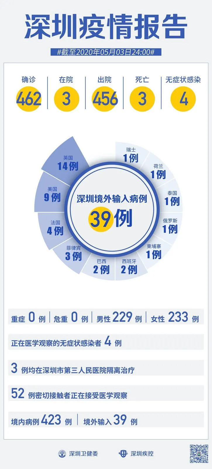 截至5月3日24時,深圳累計報告新冠肺炎病例462例。5月3日當(dāng)天新增出院1例。