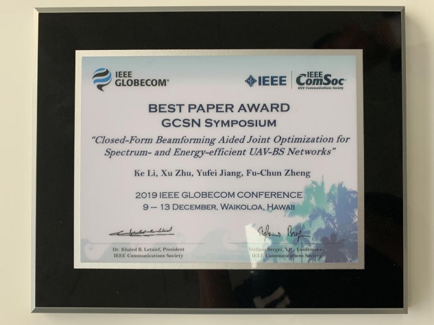 日前,由哈工大(深圳)電子與信息工程學(xué)院2017級(jí)碩士研究生李可擔(dān)任第一作者,朱旭教授、蔣宇飛助理教授、鄭福春教授為共同作者,哈工大(深圳)為第一通訊單位完成的論文《三維波束成形輔助的高譜效和能效的無人機(jī)基站網(wǎng)絡(luò)的聯(lián)合優(yōu)化》(“Closed-Form Beamforming Aided Joint Optimization for Spectrum- and Energy-Efficient UAV-BS Networks”)入選通信領(lǐng)域頂級(jí)會(huì)議Globecom2019 (IEEE Global Communications Conference2019),并獲得最佳論文獎(jiǎng)。