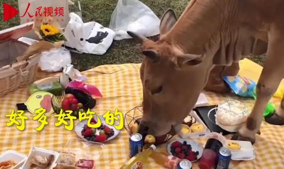 最近福建福清的幾位同學(xué)吭哧吭哧爬了一個小時的山,在草地上剛鋪好餐布擺完食物,正準備拍照時,來了一頭牛……