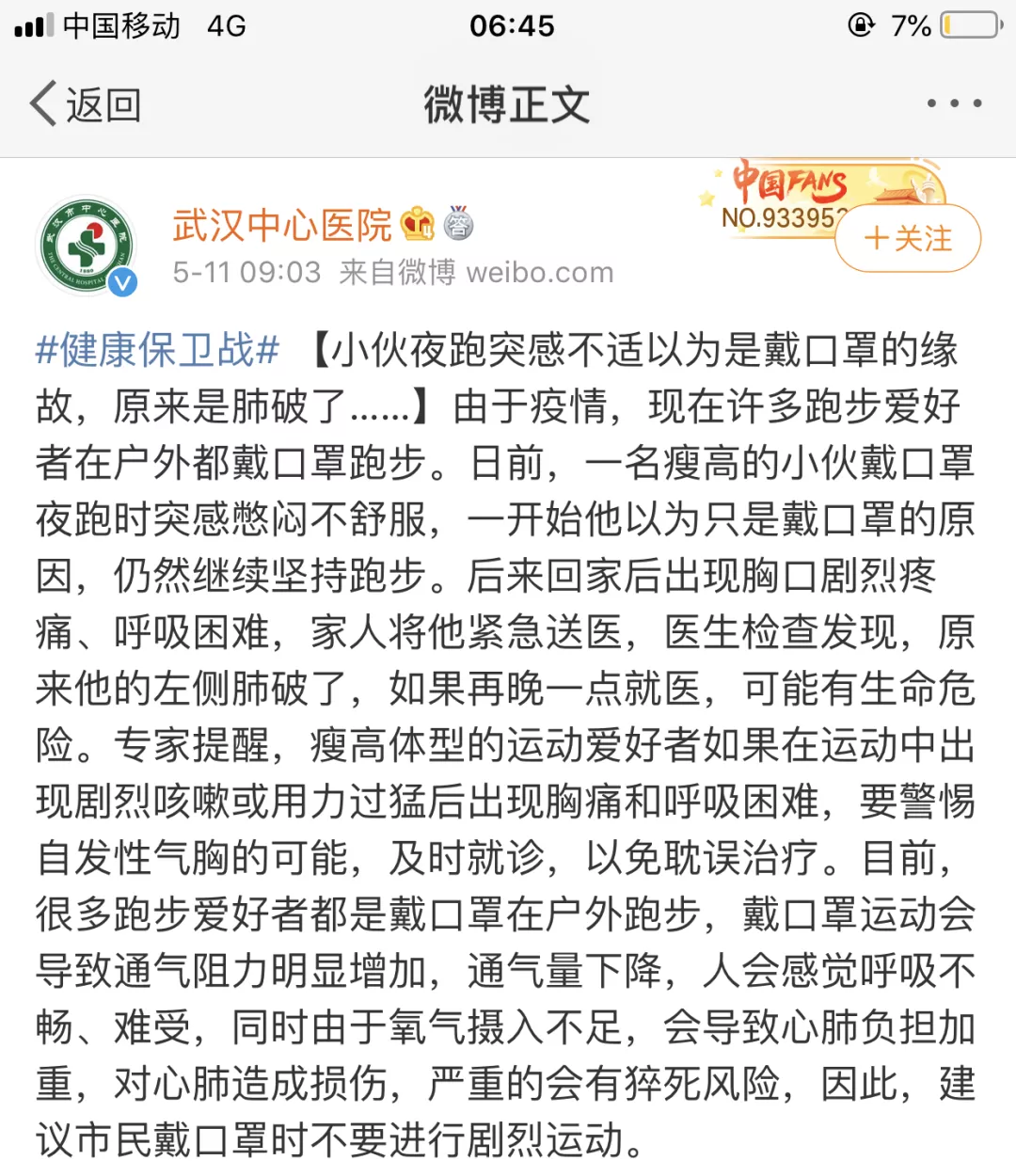 武漢26歲小伙戴口罩跑步突感不適