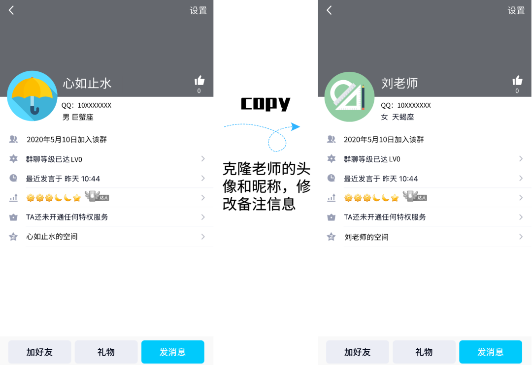 1、克隆老師的頭像和昵稱(chēng),修改備注信息。